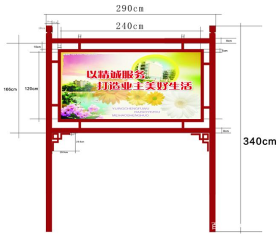 ①仿古宣傳欄仿古宣傳欄用于園林、公園等戶外場所,通常選用不銹鋼鏡面或拉絲板,鈦金板,玻璃,亞克力板,銅板,鋁板,冷軋板,大理石,不銹鋼管,實木作為表面材料,內(nèi)部結(jié)構(gòu)采用不銹鋼管,黑色金屬型材為加強材料,發(fā)光源用LED,等離子燈,霓虹燈,導(dǎo)光板等相關(guān)材料。標(biāo)識的制作工藝;金屬采用焊接,折彎,洗槽,車床,水切割,線切割,打磨,拋光,拉絲,電鍍,氧化,腐濁,烤漆。亞克力和玻璃表面采用絲印,貼即時貼,雕刻,噴砂等工藝根據(jù)設(shè)計圖紙來綜合加工.