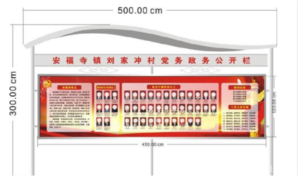 ?③黨政或小區(qū)大型宣傳欄的高度一般在兩米二以上,可帶頂棚,也可不帶頂棚,不帶頂棚的可以稍矮一些。頂棚材質(zhì)多為陽光板,也可是玻璃,或不銹鋼板。其寬度一般在兩米五左右,也有豎版的公告欄,寬度在一米左右。制定宣傳欄的寬度時應(yīng)考慮公告欄內(nèi)部放置內(nèi)容的尺寸,寬度一般是海報寬度的整數(shù)倍,再加十幾公分,這樣能夠利用宣傳欄的宣傳空間。單元宣傳欄的寬度一般在一米以內(nèi),橫版的較常見一些。常用規(guī)格如600mm*800mm